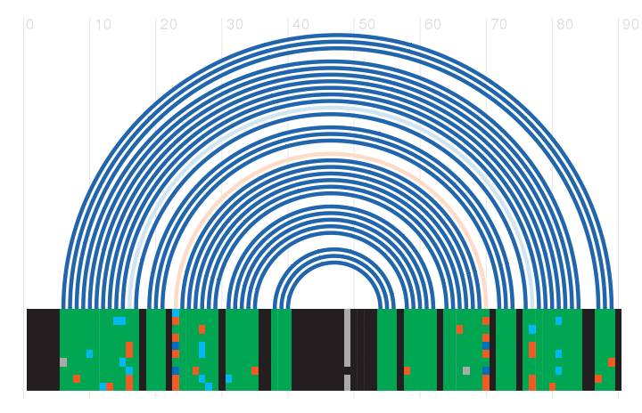 Covariance arc diagrams of 1973 family seed alignments from Rfam (v10.1). See FAQ for colour meanings.