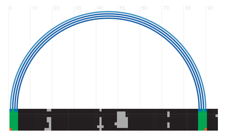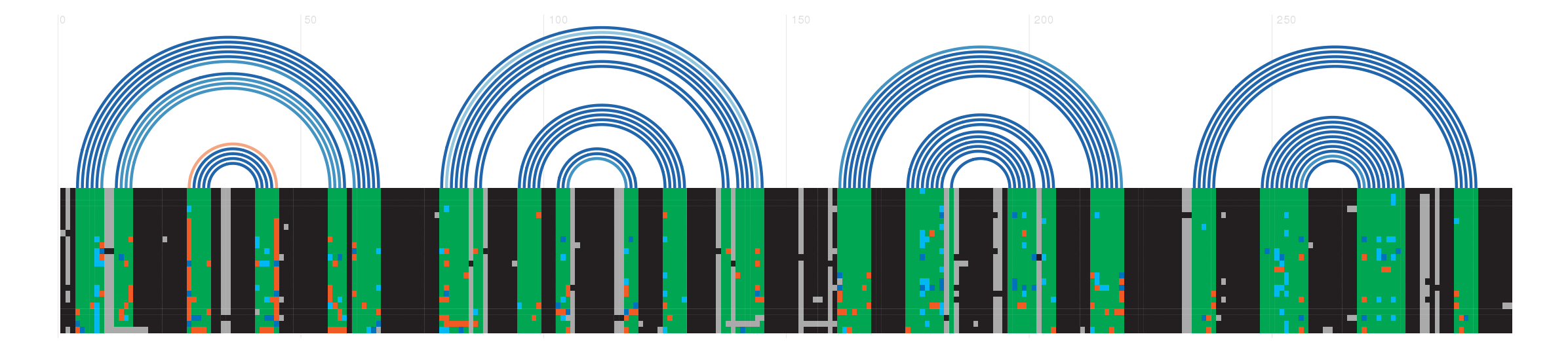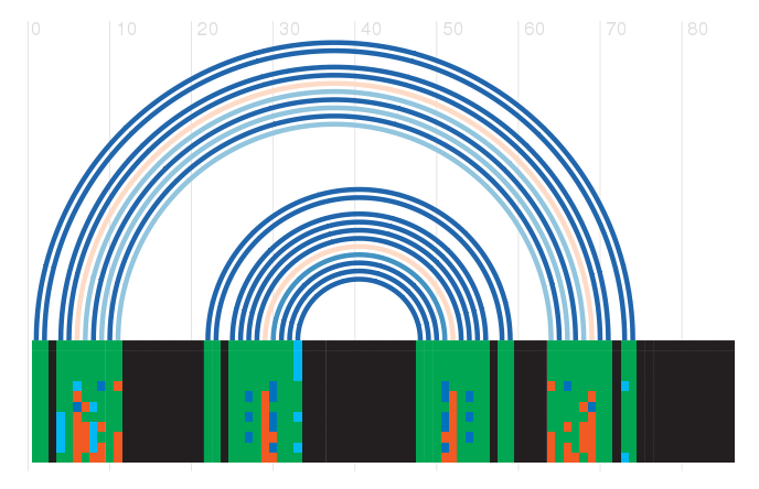 Covariance arc diagrams of 1973 family seed alignments from Rfam (v10.1). See FAQ for colour meanings.